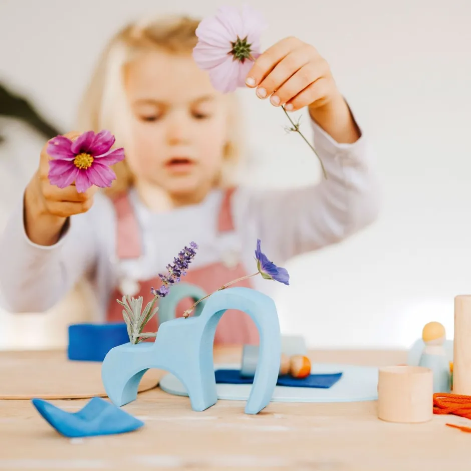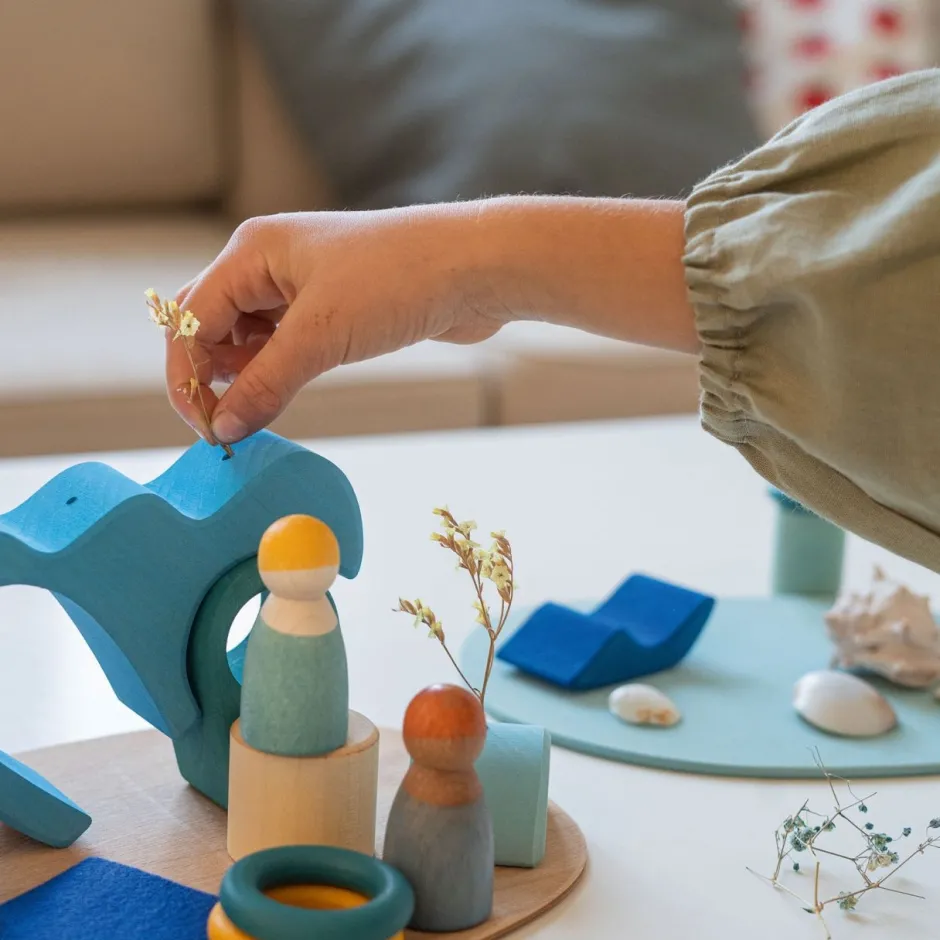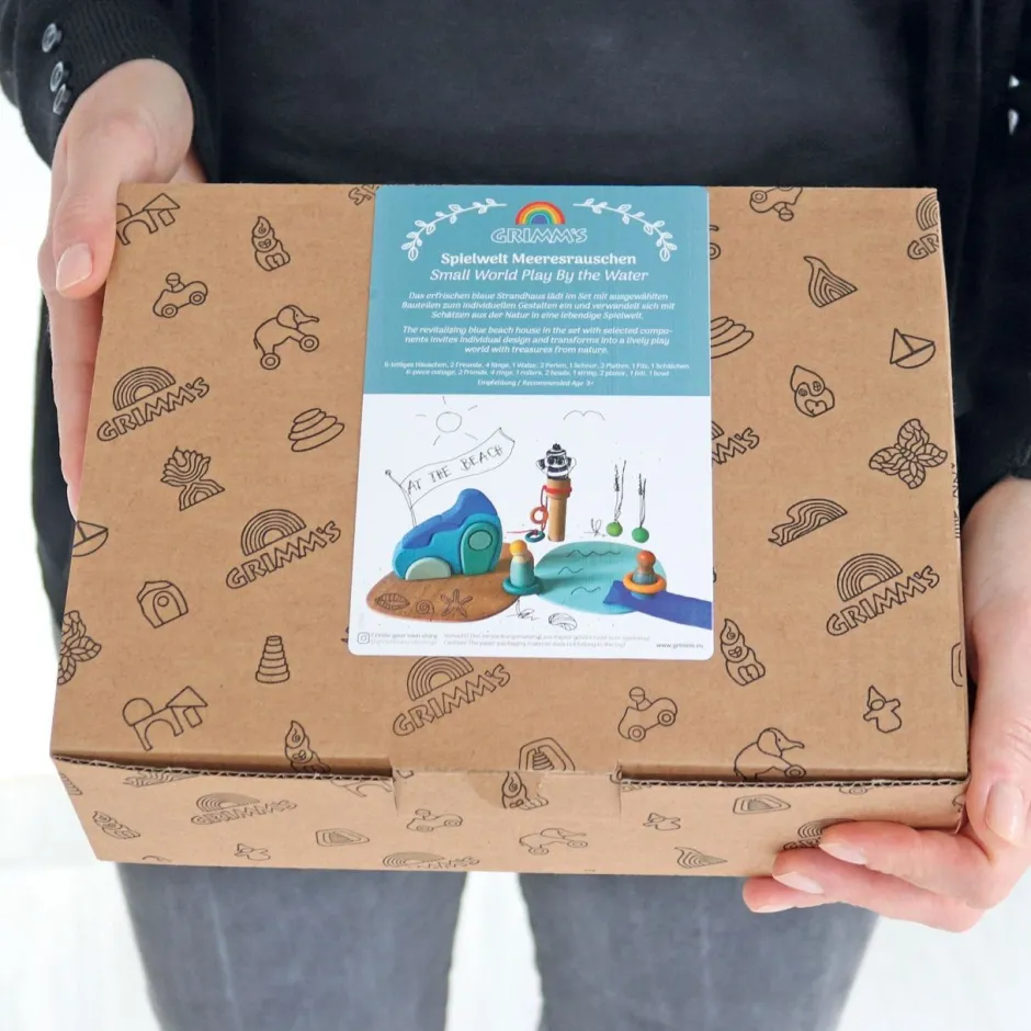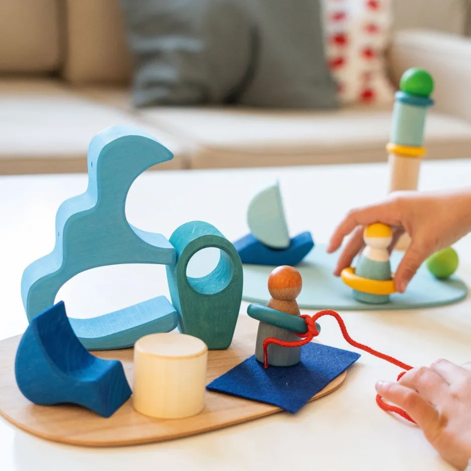 Deze houten set van Grimm's komt uit de speelwereld serie. De set bestaat uit 2 houten vrienden, 1 rol, 4 ringen, 2 parels, 1 schaaltje, 2 platen, 1 snoer en een stukje vilt.