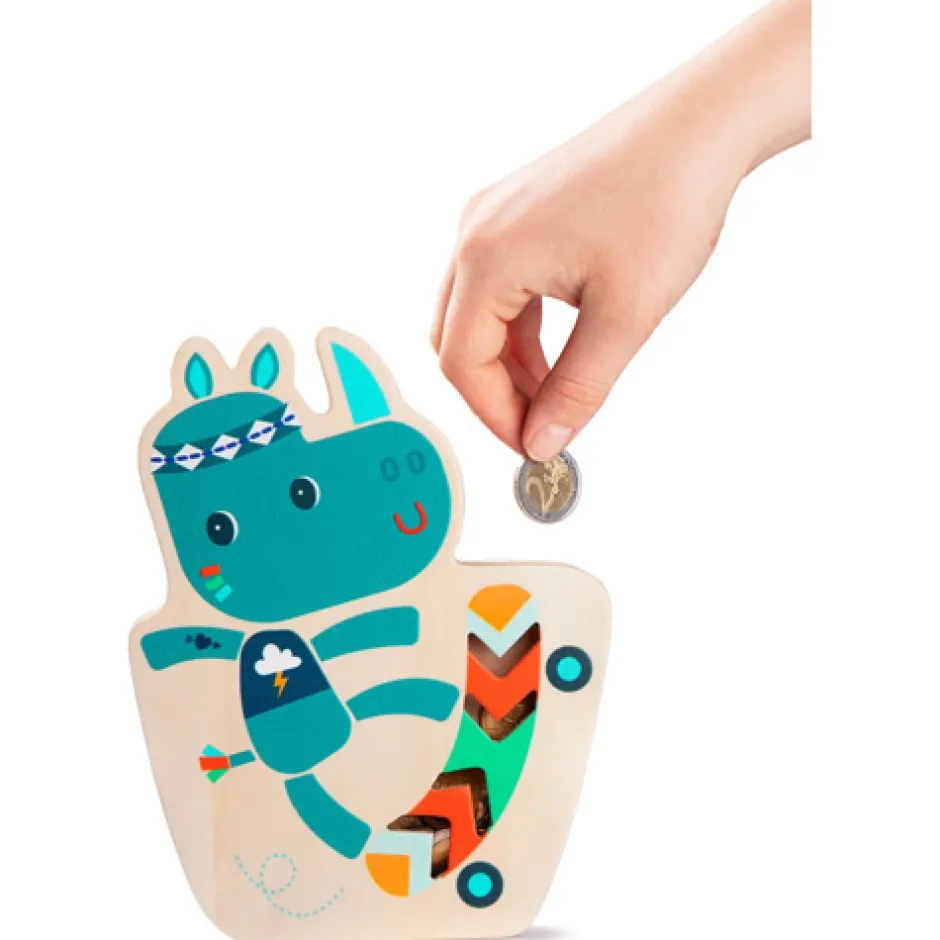 Marius de neushoorn van Lilliputiens waakt over jouw spaarcentjes in deze mooie houten spaarpot. Door de gaatjes aan de voorkant kun je zien hoeveel je al gespaard hebt. Aan de achterkant is een opening gemaakt om bij het geld te kunnen.