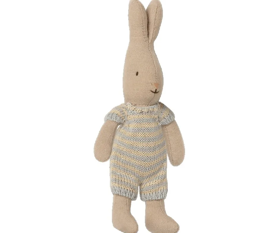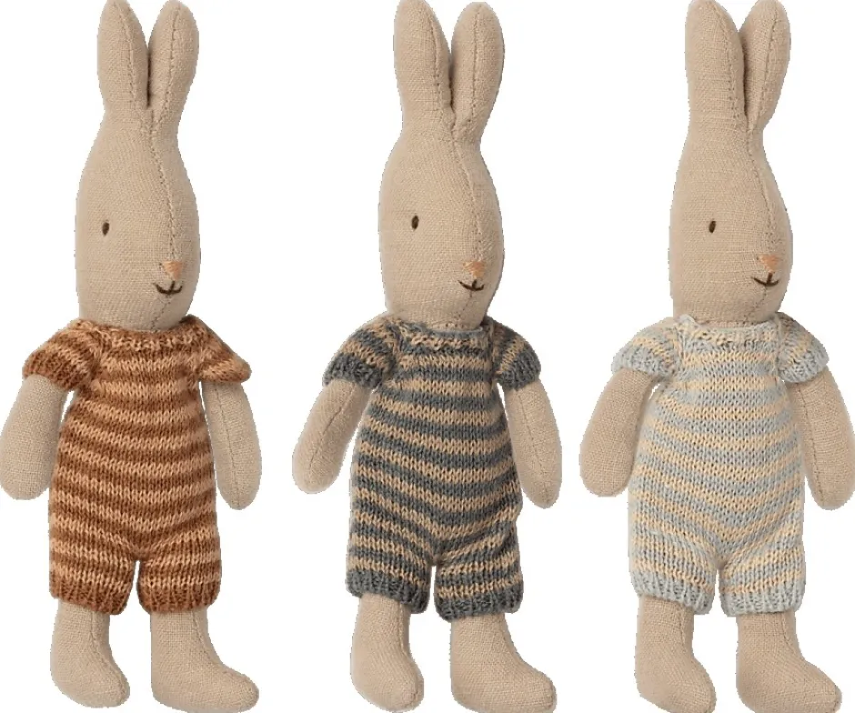 Dit lieve konijn in microformaat is gekleed in een gestreept pak gebreid in een zachte linnen/katoenmix. Het past op alle meubels van microformaat en zorgt voor vele uren speelplezier. Het pak is gemaakt in 3 mooie combinaties en wordt willekeurig gelever