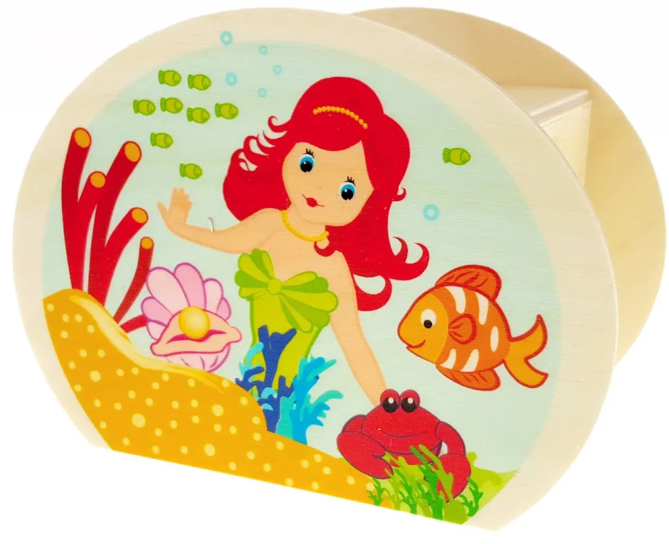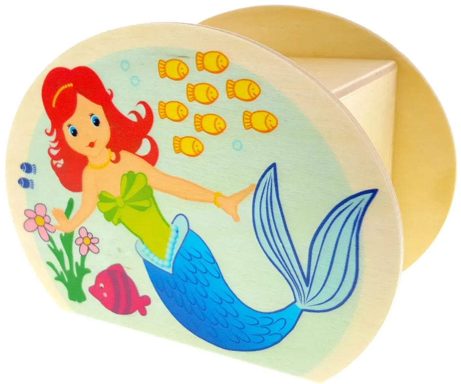 Een spaarpot die met de hand gemaakt is van hout. Deze spaarpot van Hess heeft aan beide zijden afbeeldingen van een zeemeermin. Leuk om te geven of te ontvangen.